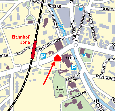Die Kinderkrippe Spatzennest liegt an der St.Gallerstrasse, neben dem Gasthaus Kreuz im Zentrum von Jona im ehemaligen Pfarrhaus der katholischen Kirche. In zwei Minuten sind sie beim Bahnhof Jona (S5 und S15 nach Rapperswil und Zürich), ebenso schnell bei der Bushaltestelle Kreuz (nach Rapperswil und Eschenbach) und natürlich in den Einkaufsläden von Jona. |